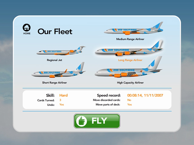 Let Air Solitaire take you on a relaxing flight! This classic solitaire game even lets you unlock new soothing songs and beautiful backgrounds that make your experience truly first-class. Match cards according to alternating suit colors as you coast towards the horizon and your next solitaire game. Unlock new airplanes with their own difficulty levels, and become a Frequent Flyer on Air Solitaire!