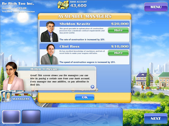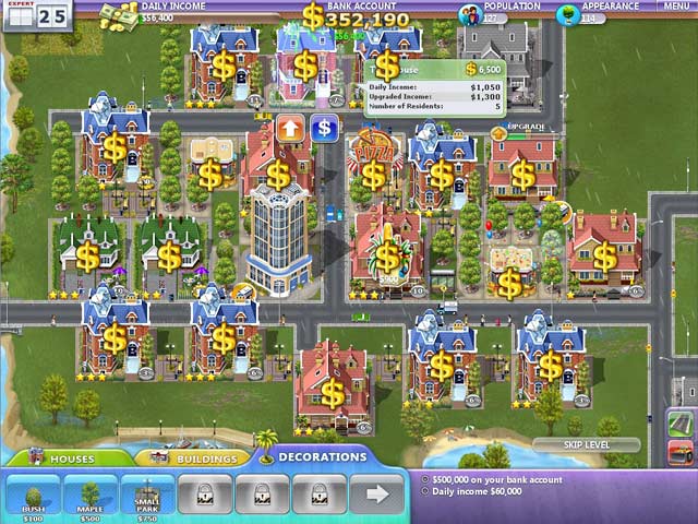 Earn your riches in the real estate market in this exciting Time Management game. Build your company from the ground up, as you build houses, mansions, stadiums and even whole neighborhoods in Be Richer! Keep your tenants happy by constructing huge shopping centers, providing maintenance, and meeting their expectations. Plan beautiful cities as you reach your goals, turn a tidy profit, and Be Richer!