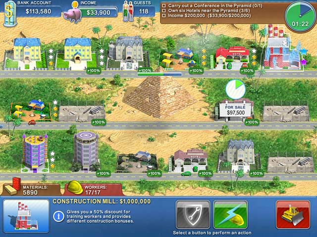 Lynette's conniving husband has cheated her out of her family business! Use your business savvy, and Time Management skills, to help Lynette repurchase her company and send her husband to the slammer. Buy, develop and sell commercial properties to make a profit. Build attractions that increase your income, and keep your eye on the bottom line as you purchase materials and hire workers, and become a Hotel Mogul!