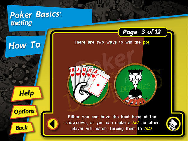 Learn when to hold `em and when to fold `em in this exciting, user-friendly poker suite! Learn the ropes of several popular poker variations and sharpen your new-found skills at the practice table. When you're ready take your poker face to a real game; ante, call, bluff, and bet your way to the bank in this thrilling, educational card game! Go all in with Poker for Dummies!