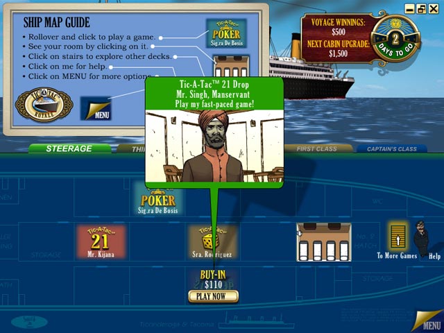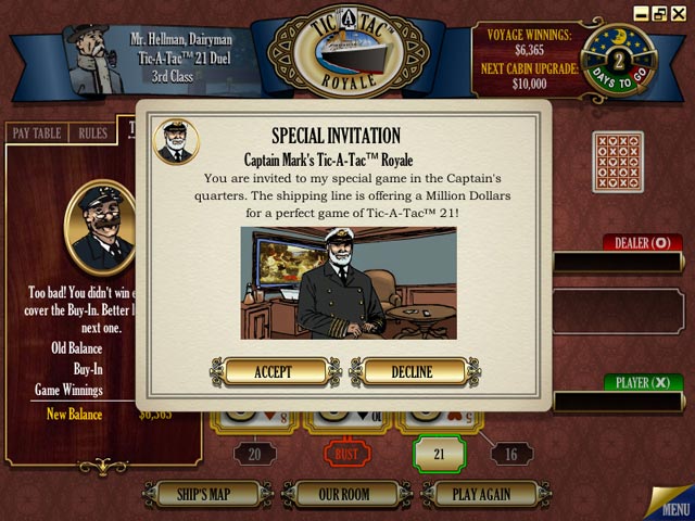 Prepare to set sail aboard the S.S. Tic-A-Tac Royale as you strike out for a new home and a new life. Can you change your future and build your fortune, playing Tic-A-Tac( TM ) with your shipmates, before you reach your destination? The games in Tic-A-Tac( TM ) Royale combine Tic-Tac-Toe with casino games to create hours of card playing fun. Play well enough and you can transform yourself from a mere pauper to a millionaire!